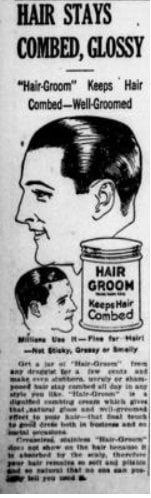 > Get a jar of “Hair-Groom” from any druggist for a few cents and make even stubborn, unruly, or shampooed hair stay combed all da in any style you like. “Hair-Groom” is a dignified combing cream which gives that natural gloss and well-groomed effect to your hair — that final touch to good dress both in business and on social occasions.