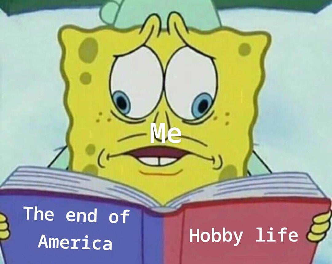 It is a weird feeling of watching the news and seeing the writing on the wall, but then jumping into hobby discussion boards as if everything isn't going to shit and we are still behaving like it's 2010. I do it too, like a switch I turn on and off thinking about the world around me. Idk if it's healthy, but at this point 🤷♂️