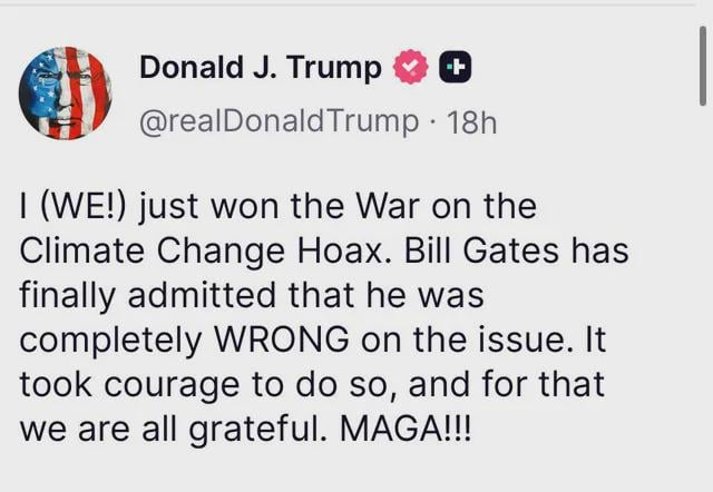 Gates didn’t say climate change was a hoax. He just said he no longer believed it would end human civilization (or something to that effect).