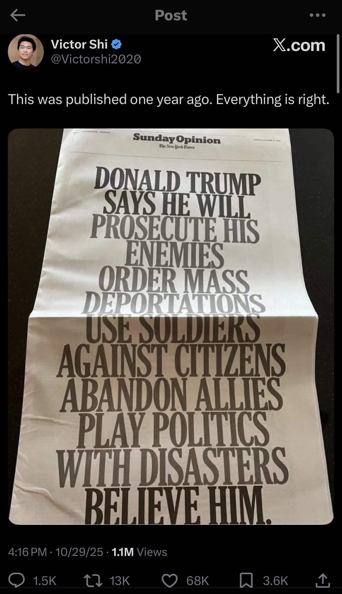Oh, and fuck The New York Times (and all the other media of record) that sane washed and normalized Trump’s behavior all the way to the election and continue to do so now even as he has to be led around East Asia like a lost duckling and can’t even find his own way off stage.