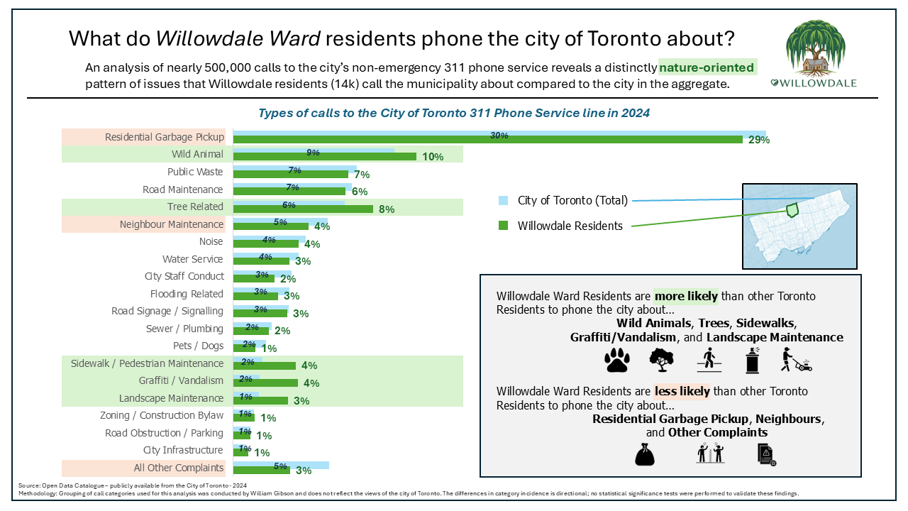 I was looking at the publicly available 311 call data for fun (I have odd interests) and I decided to conduct a little investigation into the types of calls that Willowdale Ward residents over index vs under index on compared to the wider municipality.