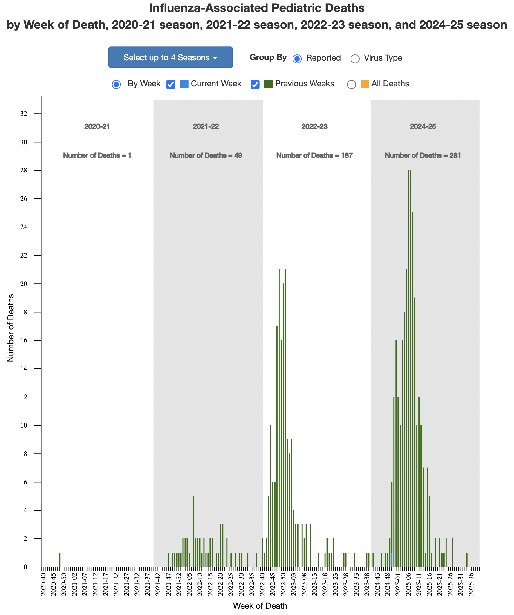 In the US, the 2024-25 flu season was the deadliest non-pandemic flu season for American kids in history. 281 American children died from the flu, with nearly 90% of them being unvaccinated. Flu deaths are up sharply from the COVID-19 pandemic years, when isolation measures limited flu infections.