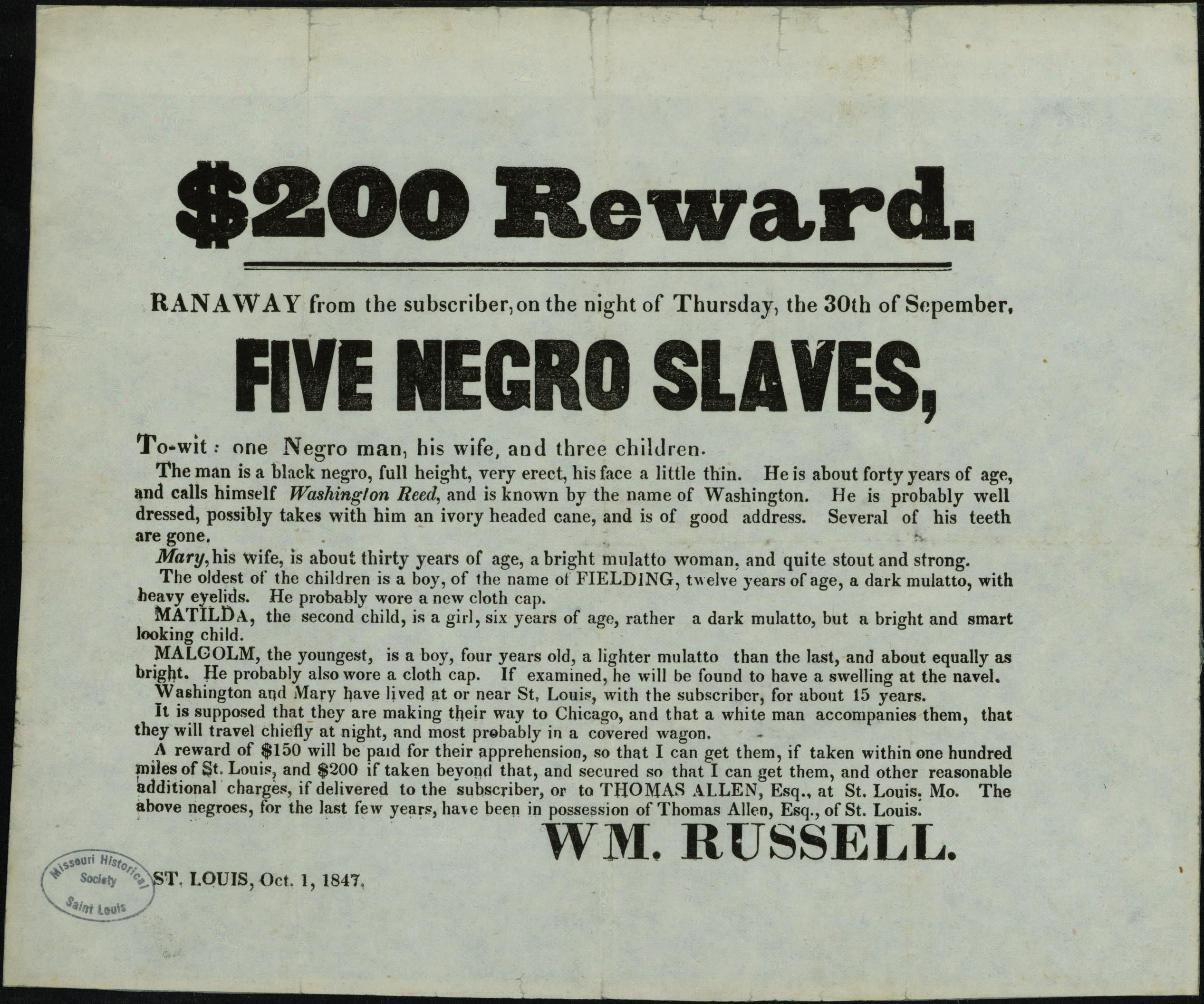 Broadside advertising a $200 reward for the capture of five runaway slaves in St. Louis, Missouri, which is dated October 1, 1847. [2533×2113] by chubachus