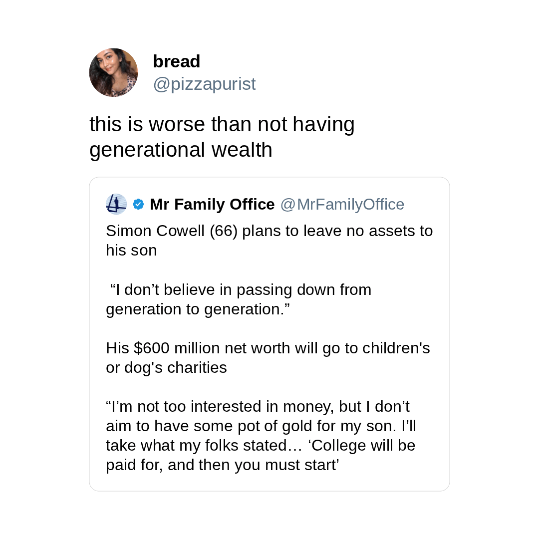 I never understood this thought process in rich people. It’s a dog eat dog world and lots of people are one or two paychecks away from poverty. Why wouldn’t you want to leave your child in the best predicament possible? Teach them from young not to be entitled assholes though.