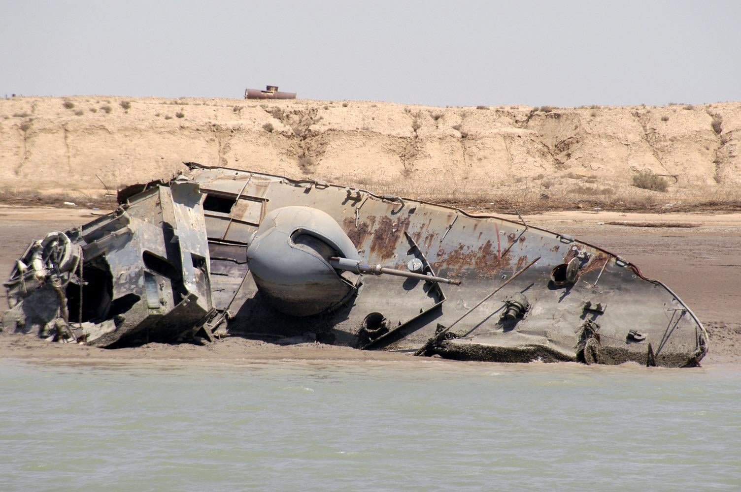 Lürssen TNC 45 design fast attack craft captured from Kuwait by Iraq in 1990 and sunk in 1991 during Operation Desert Storm on the eastern riverbank of Shatt Al-Arab in Khor Al-Zubair, Basra Governorate, Iraq. This photo was taken during the 2003 Invasion of Iraq.