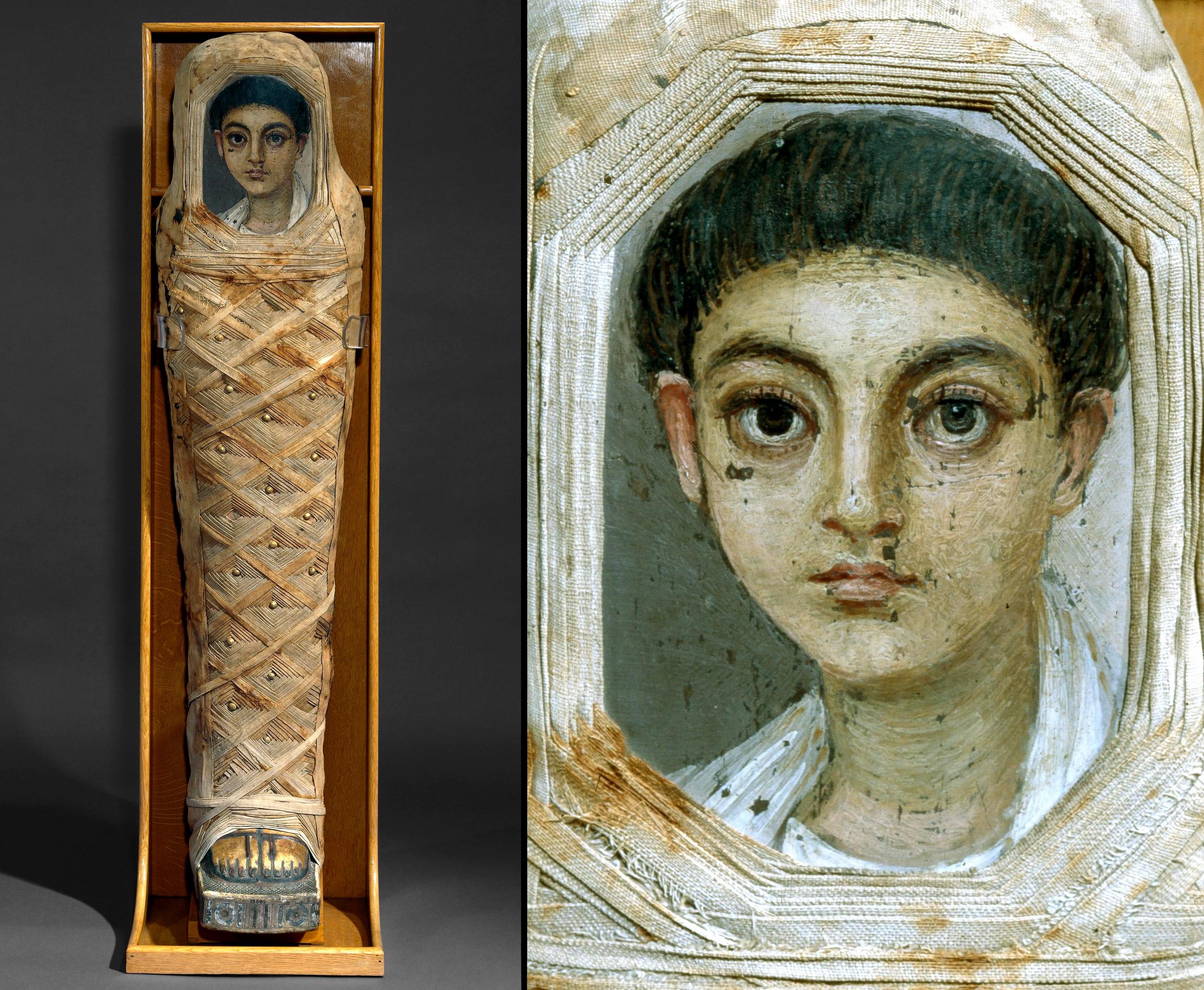 The body is wrapped in fine linen, with an encaustic mummy-portrait inserted into the bandages over the face, the front panel of the wrappings has been intricately arranged into concentric diamonds, each with a gilded stud at the centre, cartonnage foot section with polychrome painted decoration.