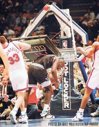 in 1992, Shaquille O’Neal made his NBA debut on the Orlando Magic. With his massive stature, Shaq made a name for himself for effortlessly breaking the backboards and rims during games. During this match in April 1993, Shaq narrowly avoided a serious injury when the scoreboard fell on top of him. It was becoming a safety hazard, and delaying games for half an hour while they set up replacement hoops. The NBA Shaq-Proofed their equipment from then on and established a rule that any player who broke the backboards or rims would be receive a technical foul. Shaq has always taken pride for destroying rims during his career and created a giant tree collage of all the rims he’s broken over the years, 19 in total.