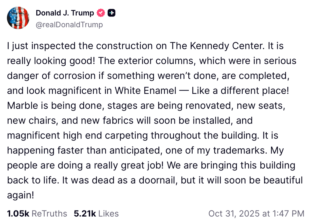 Tomorrow we’ll learn that the Kennedy Center was demolished overnight to make way for a new trump branded hotel, with an Arby’s right in the lobby!