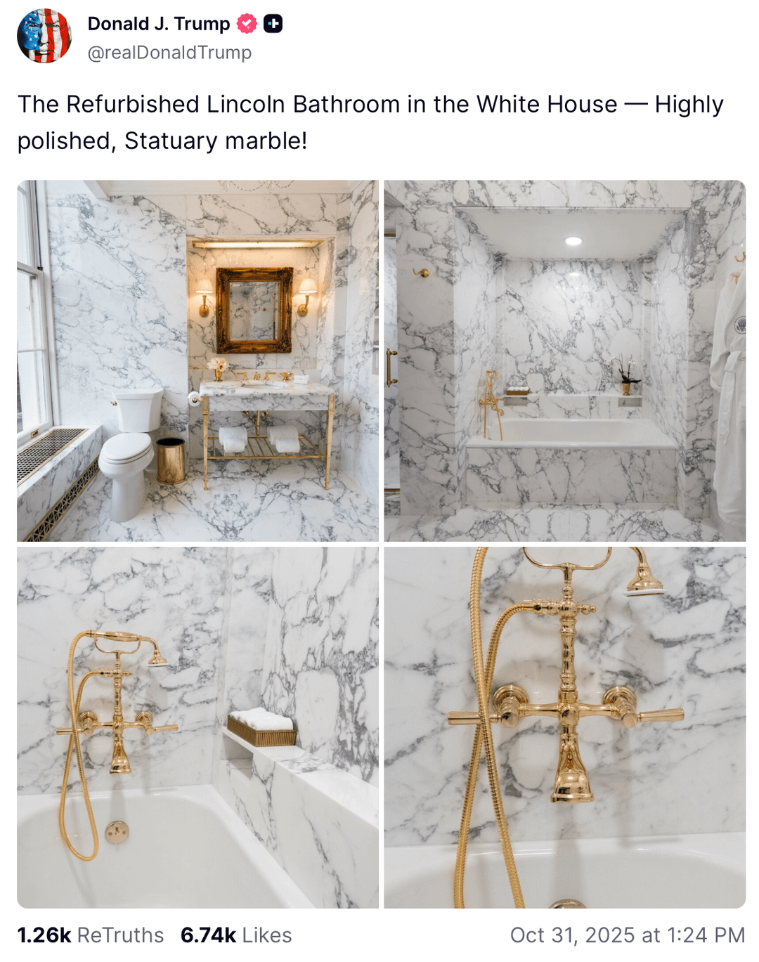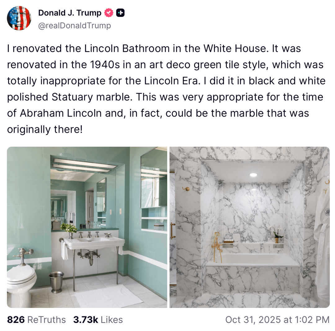 * One of the few examples of large marble panels in a bathroom interior from around the time of Lincoln, would be [Dr. Emlen Physick’s private bathroom from 1879](https://www.capemaymag.com/arts-and-entertainment/victorian-vignette/the-evolution-of-the-bathroom-during-victorian-times/#:~:text=In%20contrast%20is%20Dr.,bathroom%2C%20and%20his%20mother%20Mrs)… a bit after Lincoln… and as one can see, looks nothing like what Trump is pretending is a “historically accurate” use of marble appropriate in Lincoln’s time.