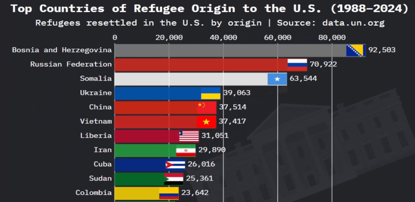 The data comes from UNHCR and the U.S. Department of Homeland Security’s Yearbook of Immigration Statistics . Bosnia & Herzegovina dominated that year, followed by Vietnam, Somalia, and Ukraine.