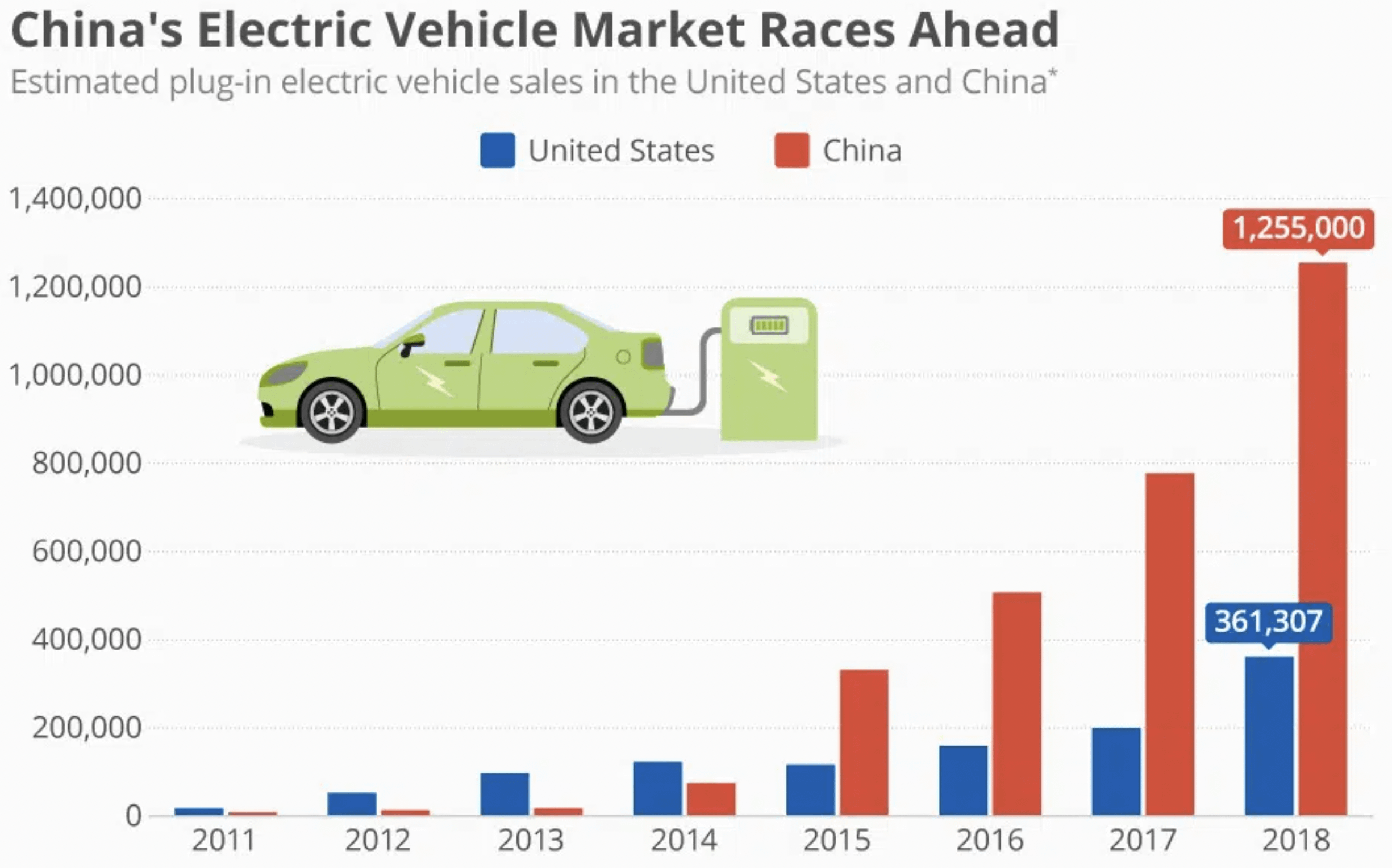 How America lost the electric car race: in 2012, EV sales in the US were several times higher than in China. However, by 2018, EV sales in China were several times higher than in the US. China has 40X more electric trucks and 120X more electric buses, a result of an aggressive electrification policy