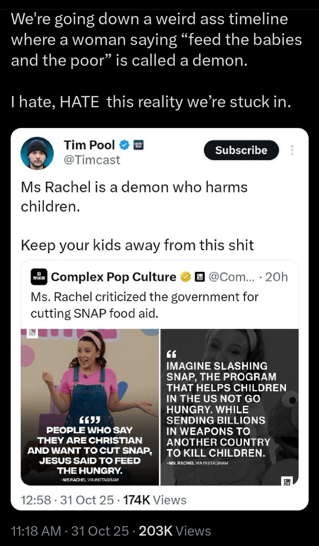 But Ms. Rachel is pointing out their lie. russian asset has spent days/weeks telling folks that undocumented people use snap and / or snap is abused. But a children program figure is calling out the lie and thus, russian asset needs to call her a demon and cancel her because of it.
