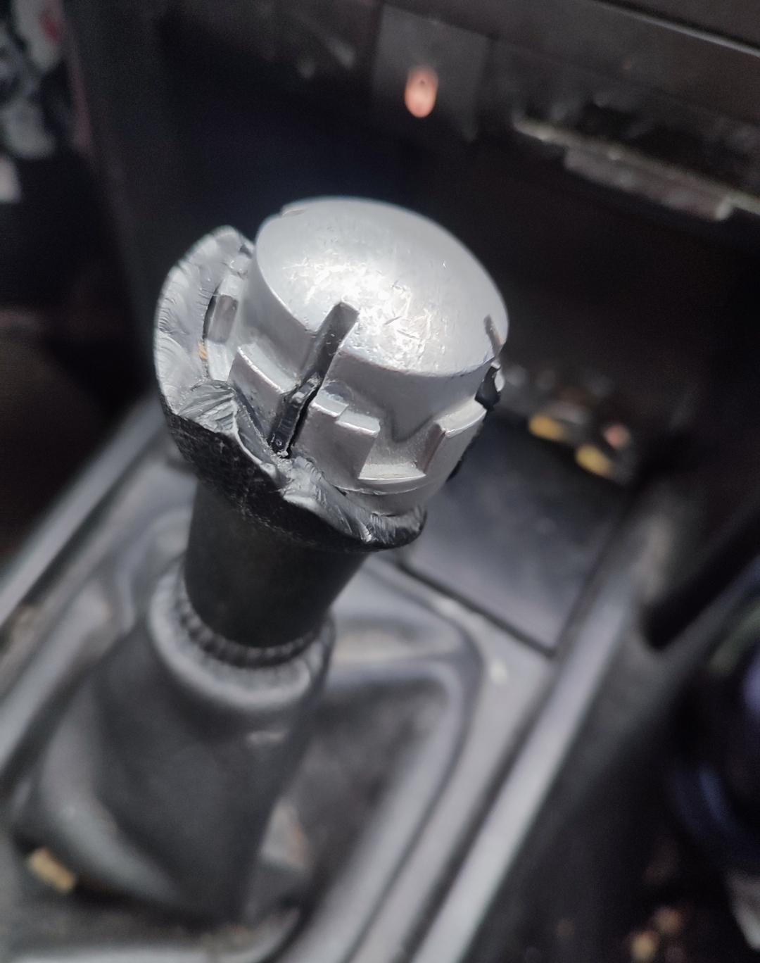 What car? The stick shift in my Mustang has started to come apart in a similar manner. Though not nearly this bad – yet anyway…