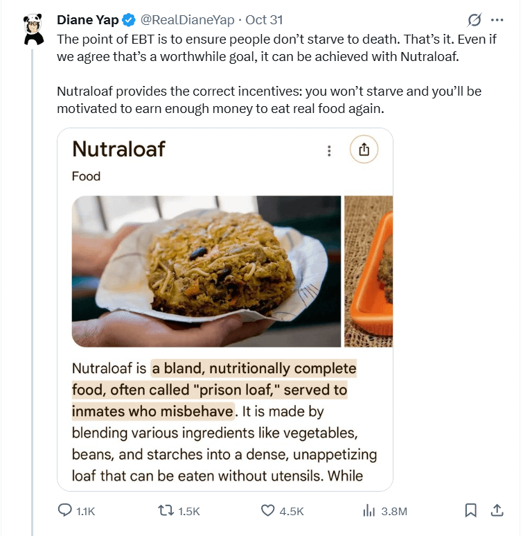 3. It is a good idea to examine the claims made or implied by this sort of stuff. Is the sole point of EBT seeing people do not starve to death? Well, no. The point is to provide support and one hopes a modicum of dignity to our neighbors in their need, as an expression of human solidarity. Not starving is an essential part of that, but is not the sole purpose. The purpose of prison loaf is punishment and humiliation.
