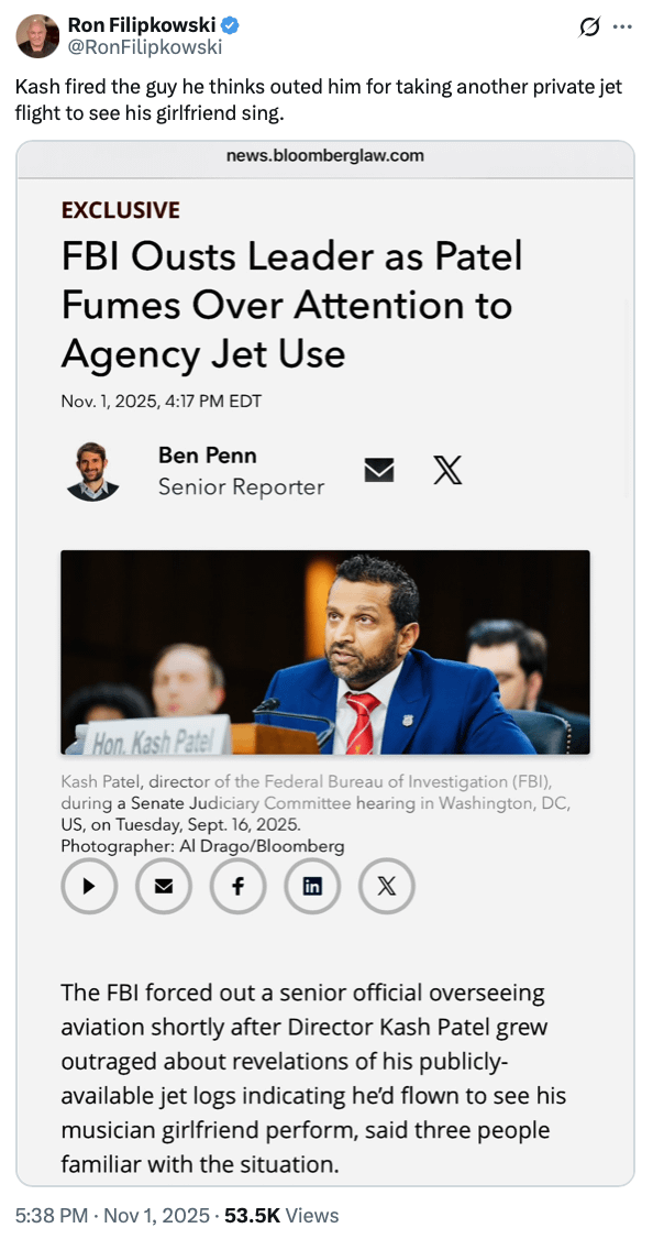 FBI Director Kash Patel fired the guy he thinks outed him for taking another private jet flight to see his girlfriend sing. by MoreMotivation