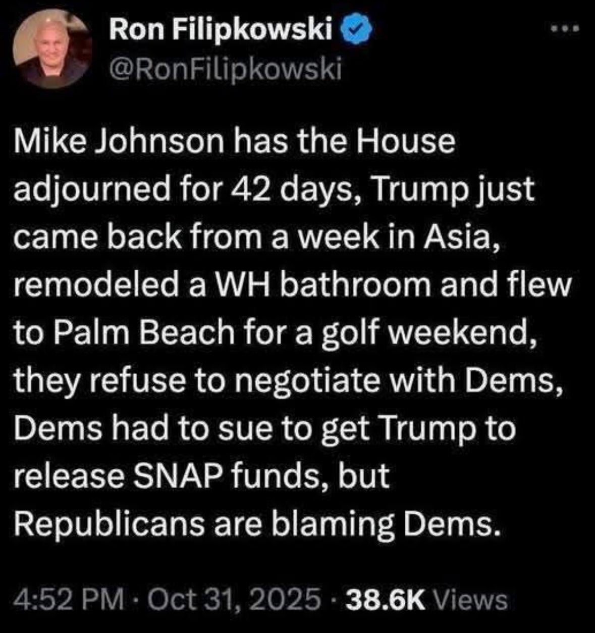 However Democrats seem to accept the blame. They should be as active as he is telling the truth that he hasn’t got his party yet and how it works. That when you are stalled you work to get the votes you don’t quit and stall the Government like Johnson and the President is doing.
