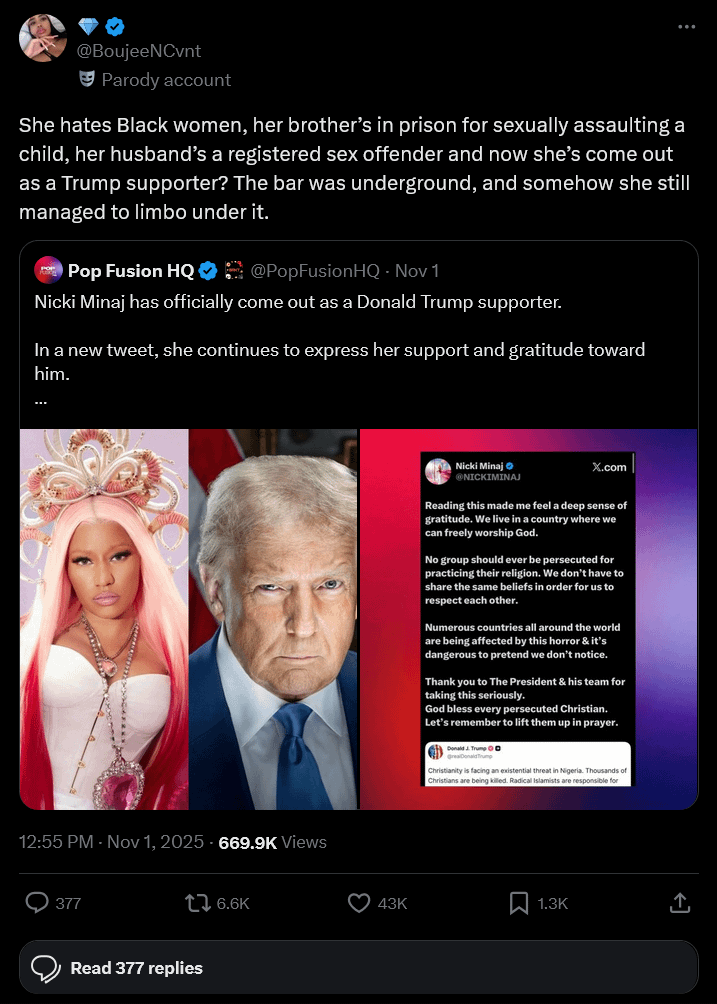 Who cares about Christians in Nigeria while people are starving and losing healthcare in America? Focus on the people you represent. Aside from that, Minaj does not have a functioning brain.