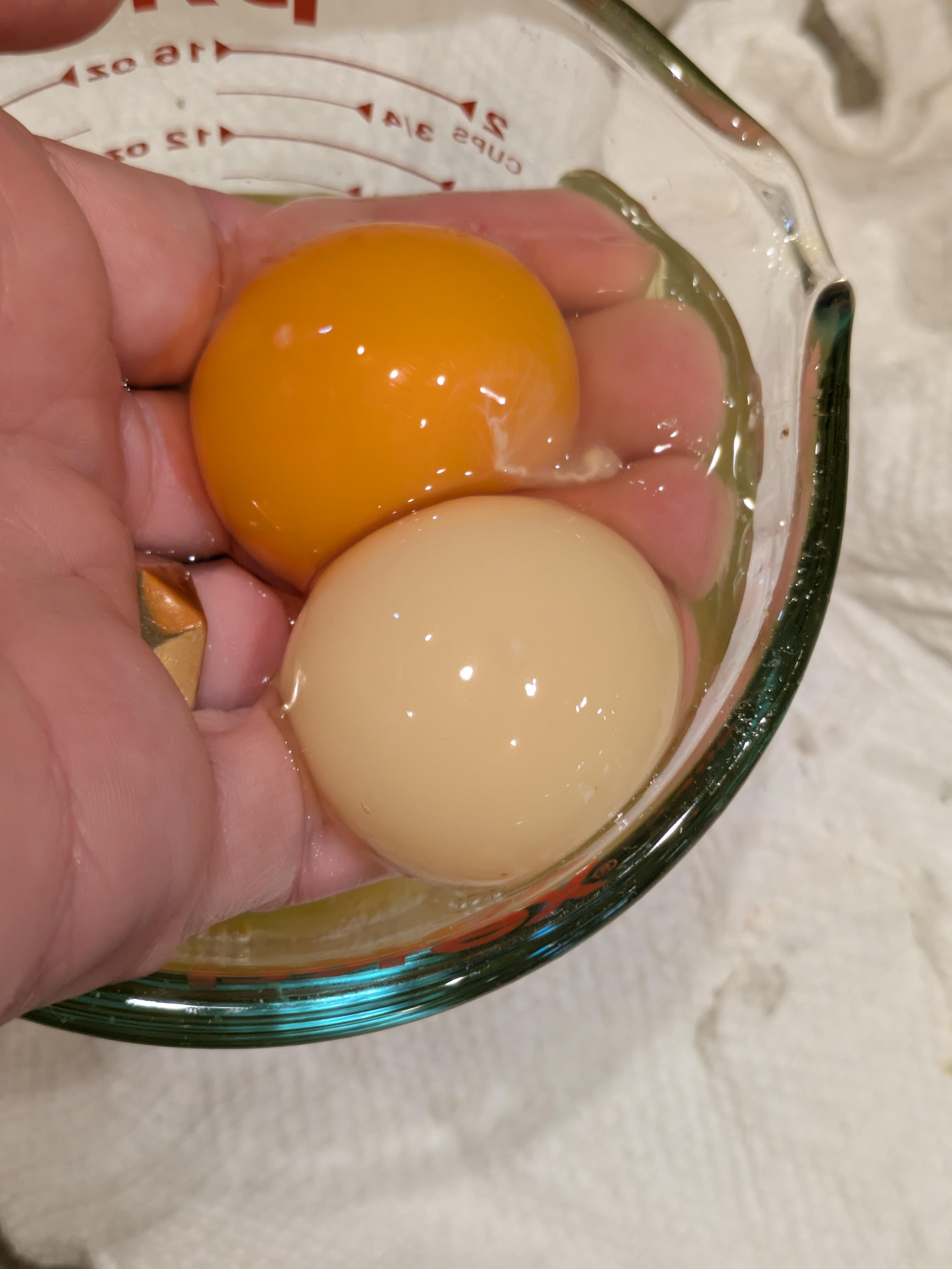 Yolk colour is strange, even stranger is you reached into the measuring cup and grabbed it? Why?