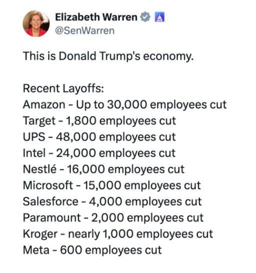 Those are all jobs taken by ai, not failing economy.  In the next 10 years layoffs aren’t gonna mean the economy is failing since these billionaires are looking to replace humans, who want fair wages, get sick, need medical insurance, and employers pay half their taxes.  They will be implementing ai everywhere they can.  Layoffs no longer meant economic downturn but people being obsolete to billionaires.   Â
