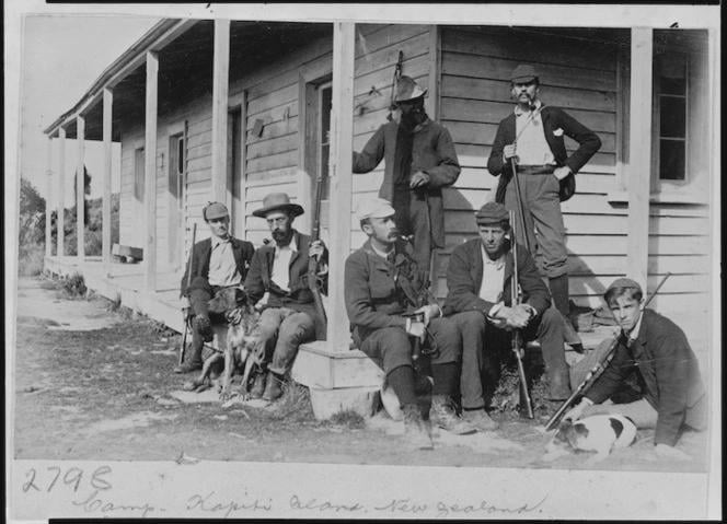 Hunters on verandah of house, Kapiti Island. Creator of Collection Unknown : Photographs of hunters on Kapiti Island. Ref: 1/2-002798-F. Alexander Turnbull Library, Wellington, New Zealand. [/records/22751434](https://natlib.govt.nz/records/22751434)