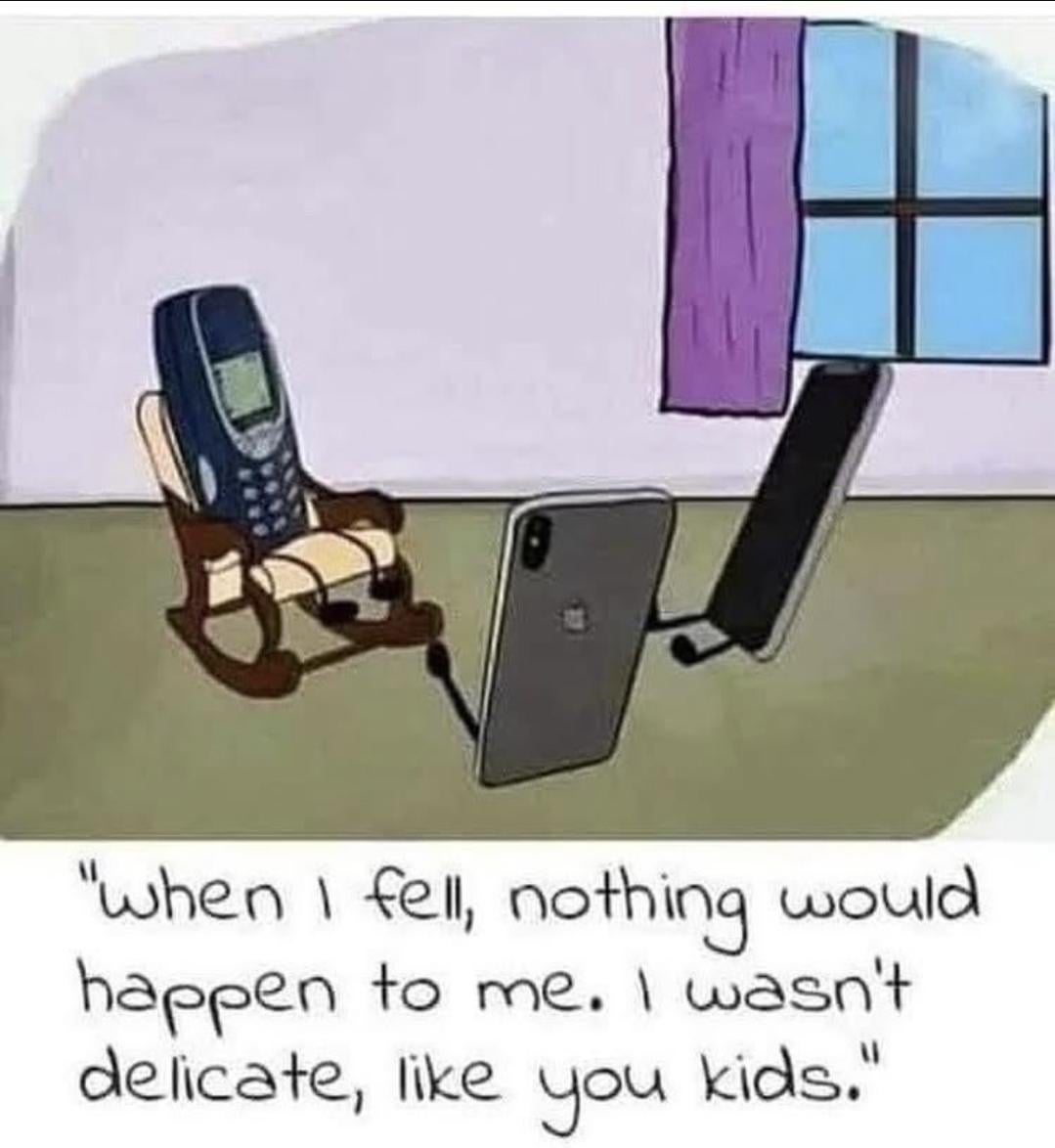 Back when phones survived concrete and still had Snake, not anxiety. Now a two-foot drop and rent cries with me.