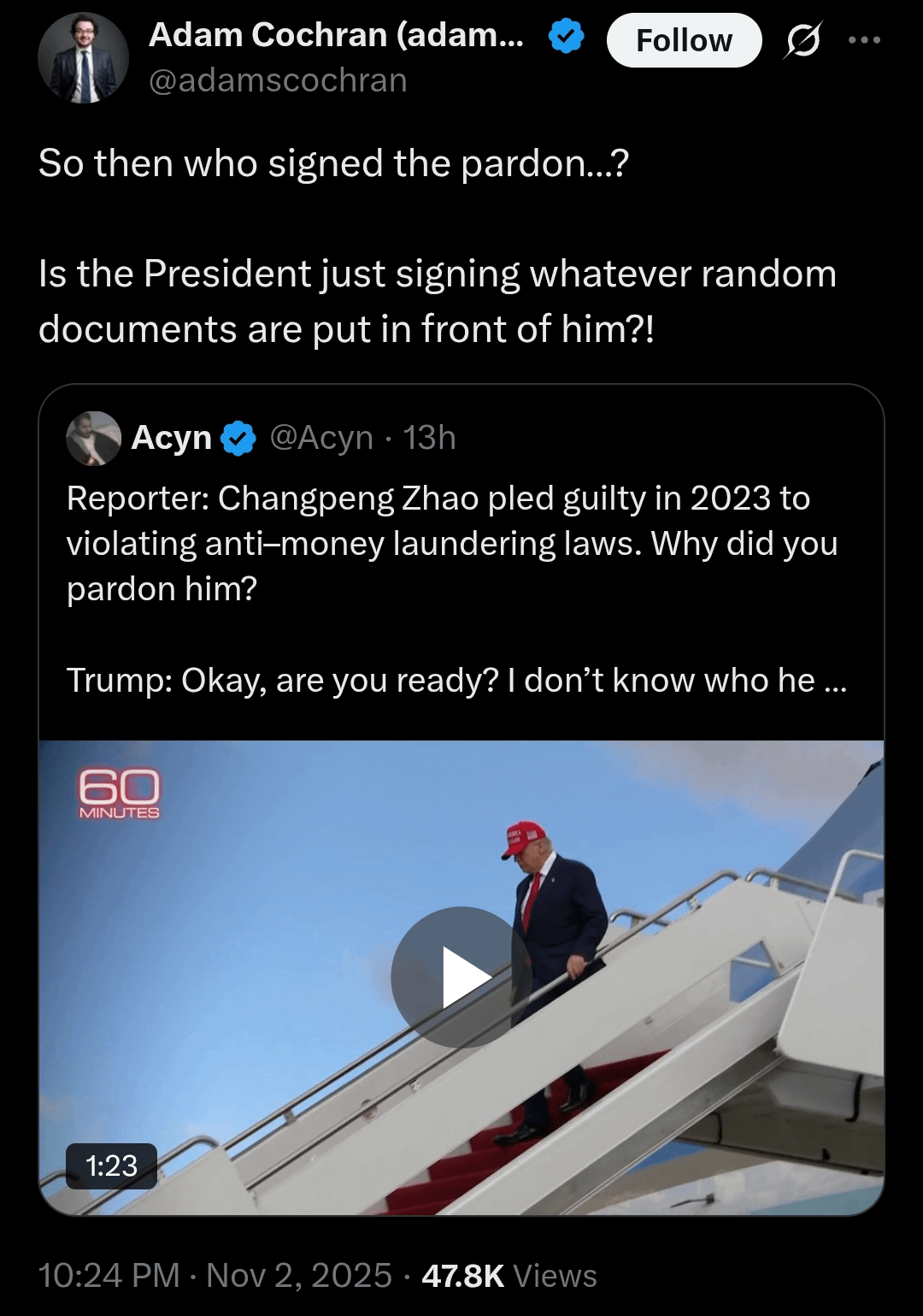 See, they are trying to overturn Biden’s pardons because he used the auto pen. And this video/conversation will be used to overturn all of Trump’s pardons because by his own admission, he just be signing shit without knowing what it does. Watch, he’s gonna try and pardon himself before he leaves so the next president can’t touch him, only to forget he tried to remove Biden’s pardons and thus set the legal record that former Presidential pardons can be revoked by future administrations.