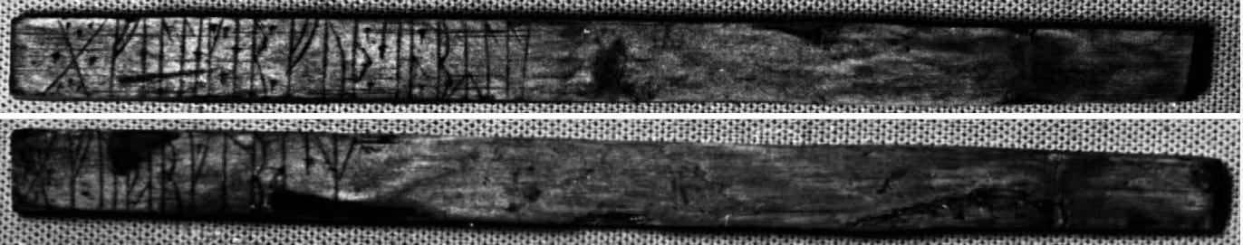 A 14th century CE rune carving on a wooden stick, from Bryggen in Norway, which says: “Lovely is the pussy, may the prick fill it up!” [1372×271]