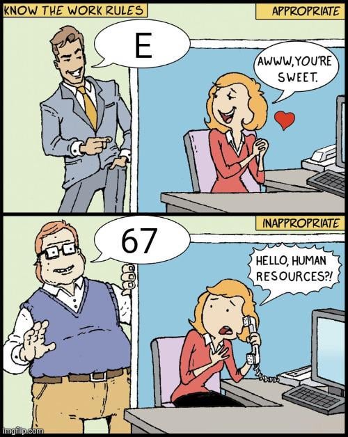 3. Tbf, E is absurdism while 67… what does 67 even mean? It’s got no meaning with the intention of meaning, if that makes sense. While absurdist stuff is to have no meaning without needing to seem like it does