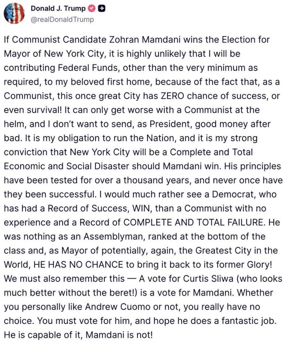So openly threatening the city to influence the election… While also forgetting most blue cities and states are what generate most of the federal funding, so basically threatening to withhold funds that nyc itself help create.