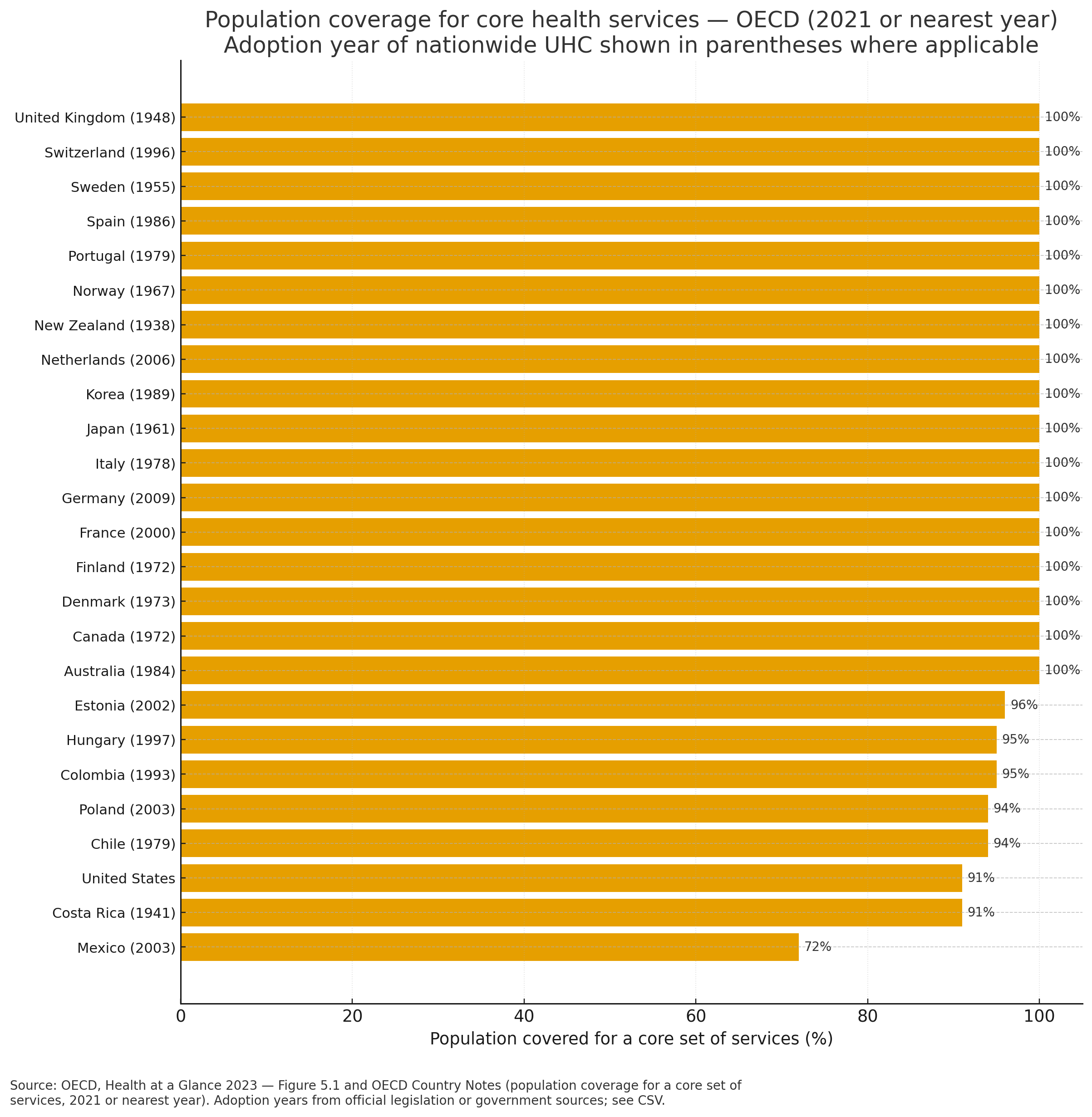 * Indicator page “Population coverage for healthcare” (definition and Figure 5.1): [https://www.oecd.org/en/publications/2023/11/health-at-a-glance-2023_e04f8239/full-report/population-coverage-for-healthcare_e999bea9.html](https://www.oecd.org/en/publications/2023/11/health-at-a-glance-2023_e04f8239/full-report/population-coverage-for-healthcare_e999bea9.html)