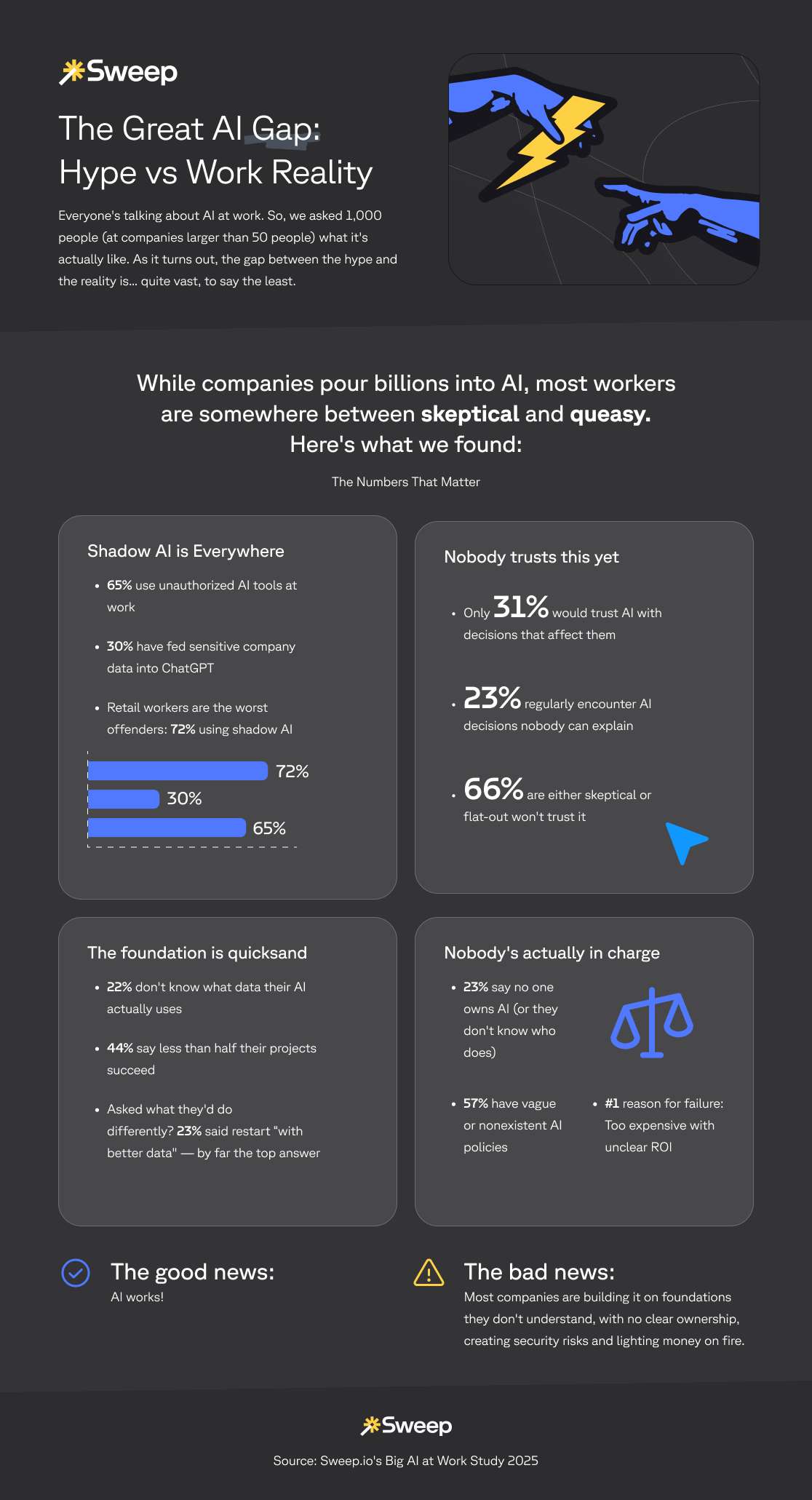 This poster reads like it was AI generated. Why is there an unlabeled bar graph comparing three unrelated questions? How does this data suggest AI works? Why are 72% of retail workers using “shadow AI”?