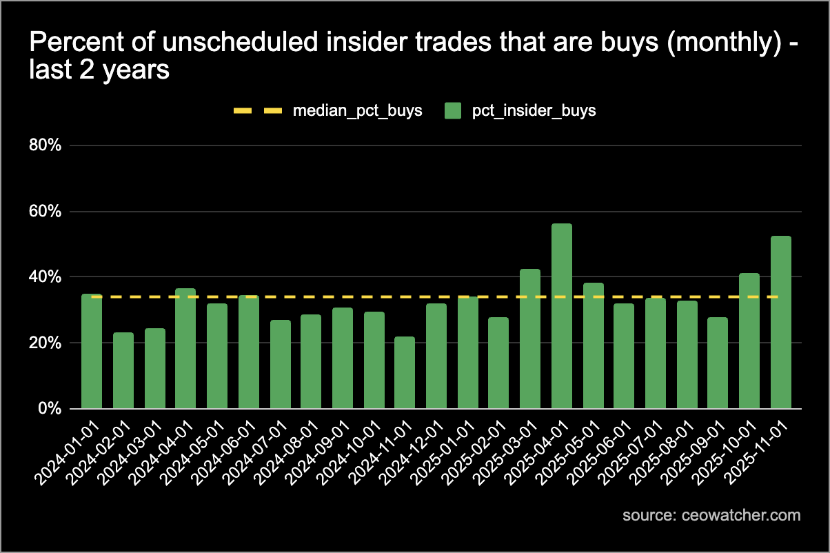 Insiders bought a ton of stock in April after Trump crashed the market with his tariffs (and those insiders did quite well). Surprisingly, October came in as the second most bullish month for insider trading in at least the last two years.