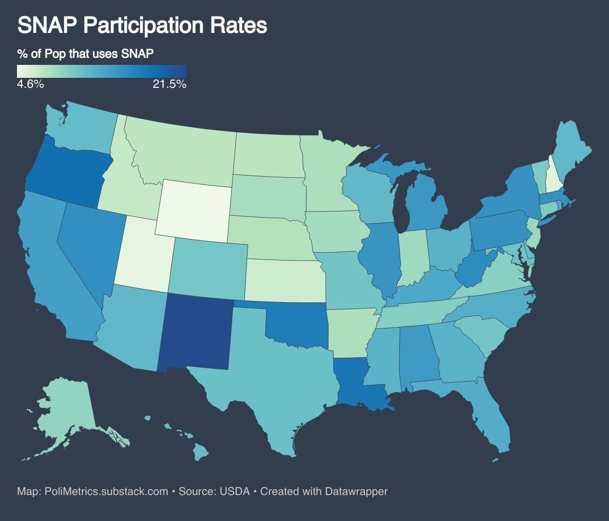 New Mexico has the highest participation rate at about 21% of their population on SNAP. Wyoming, Utah, and New Hampshire had some of the lowest rates.