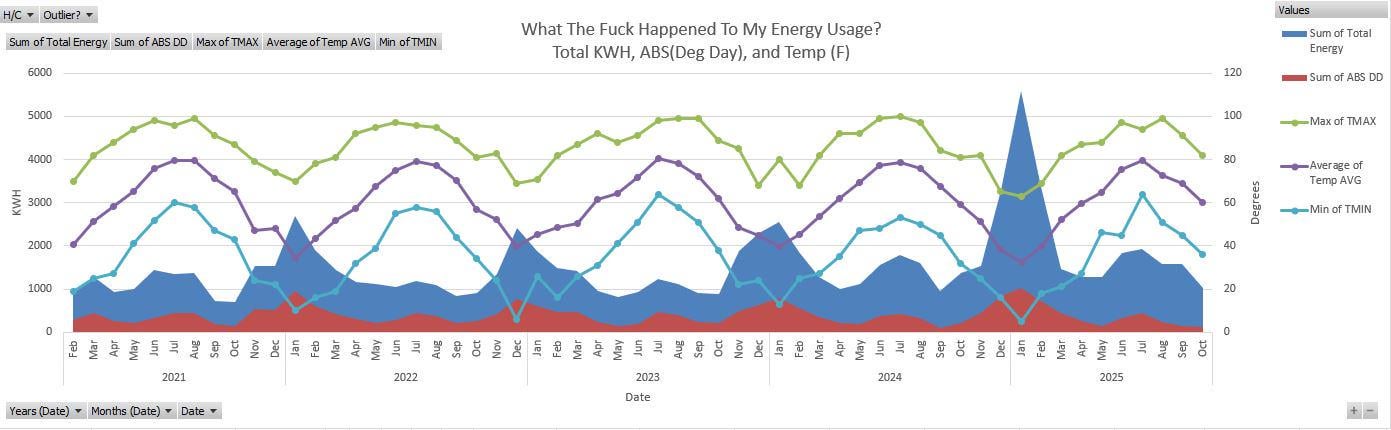 The answer to the titular question is heating and cooling my remote WFH shed (May 2024 and onward ish) and the massive spike was when my heating unit decided to run exclusively on electric emergency heat (Dec-Feb 2025)