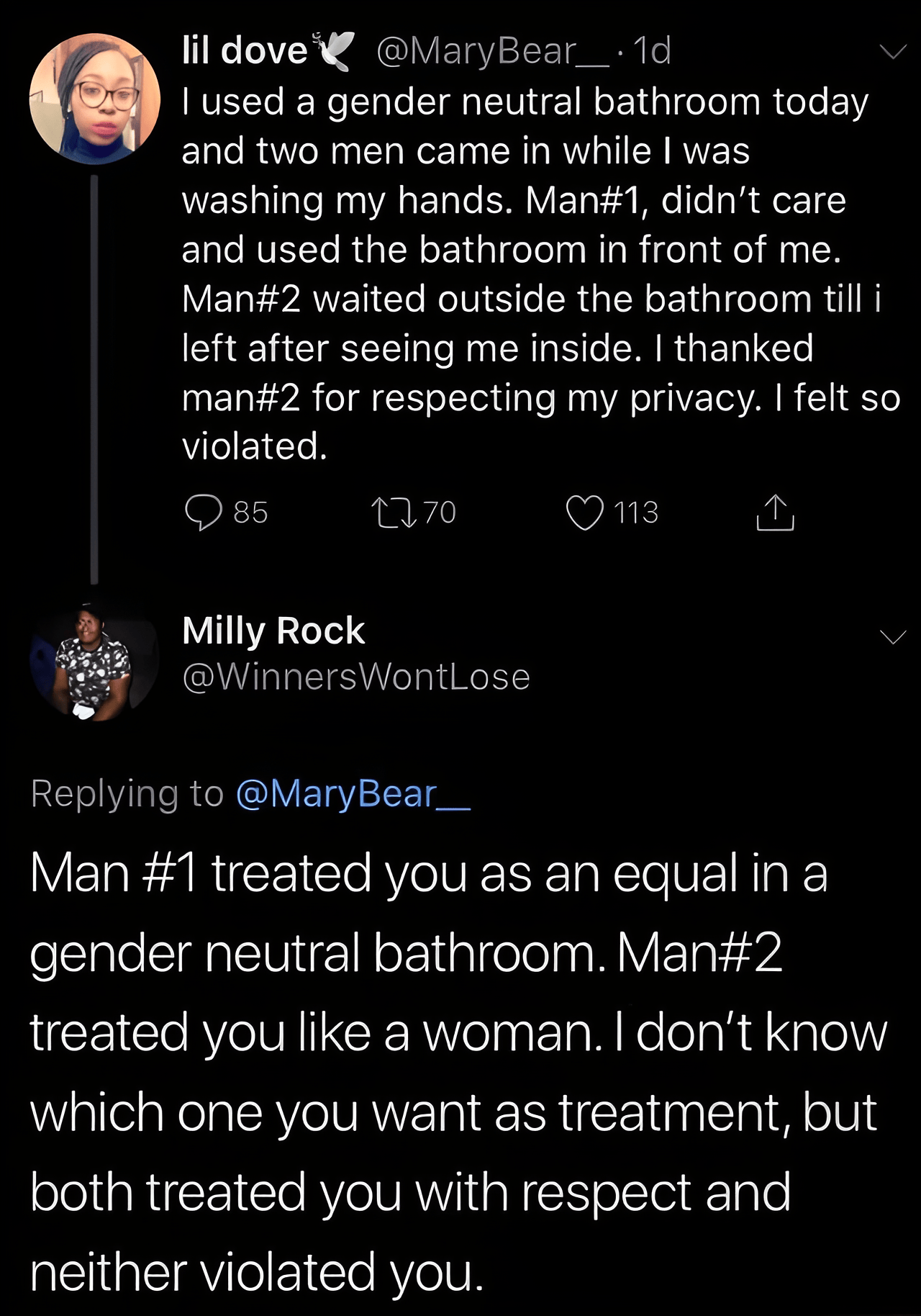 didn’t know which one she wanted? She said it.. why else would she think man 2. I mean, if I’m being honest, I would be man 1. But I really don’t think people say what they want and then know what they want. So if I walk into a gender, neutral bathroom and somebody has a problem, I can wait. Go out sometimes maybe you get out cause I gotta drop these bombs now.