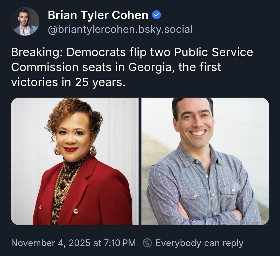 santa_91 on November 5, 2025 1:25 am The PSC has been fucking Georgia Power customers hard for a while now. People were very motivated to get rid of the incumbents.