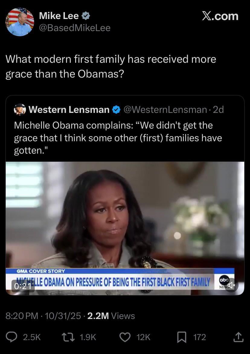 So mike lee conveniently leaves out his orange god is the one that started the bs rumor of obama not being born in the US and then was also fox news and other con media outlets that pushed the bs story Michelle was a man. Not to mention his orange god still cannot stop trashing talking Barack when he hasnt be in office in ofer 10 years.