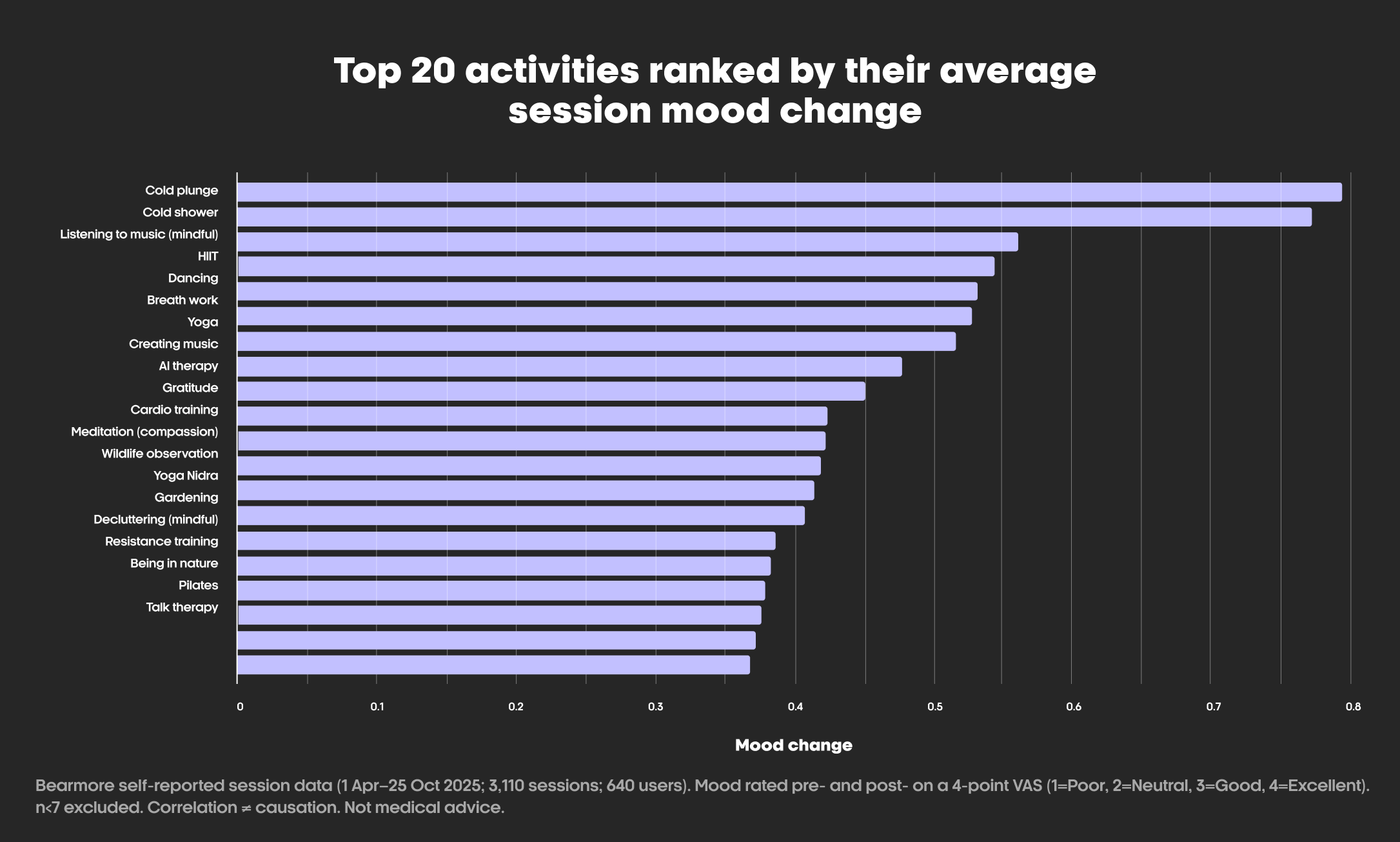 bearmore_app on November 5, 2025 2:52 am Source: anonymized logs of self-reported mood on the Bearmore app before/after 3,110 sessions across 640 individuals (activities like cold exposure, music, walking, HIIT, meditation). [Full report here](https://join.bearmore.com/mood-report/)