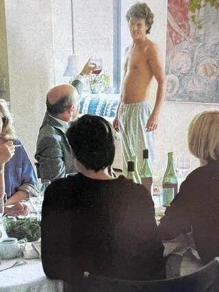 I have no idea what's happening in this photo. It looks like an early dinner, and there's a guy wandering around in pajama pants with no shirt. by Fair_Mail_5841