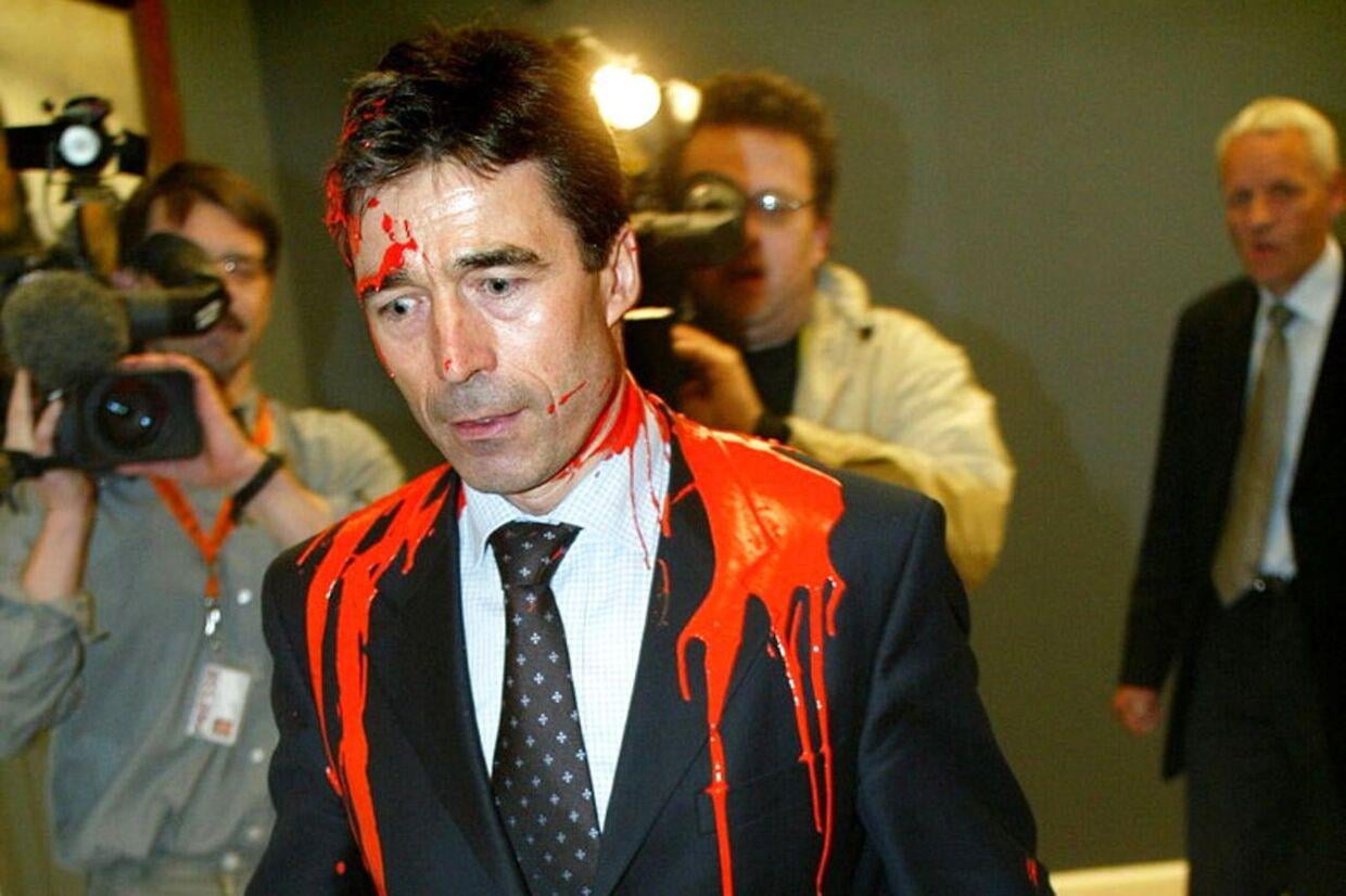 > On March 18, 2003, two Danish activists threw red paint at Prime Minister Anders Fogh Rasmussen and Foreign Minister Per Stig Møller at Christiansborg Palace (the Danish Parliament) to protest Denmark’s role in the Iraq War. Lars Grenaa threw paint at Rasmussen while shouting “You have blood on your hands,” symbolically representing the blood of war victims, and was immediately arrested by parliamentary security. The activists had gained access as guests but acted without authorization, leading to prison sentences of 3-4 months for assault on public officials.