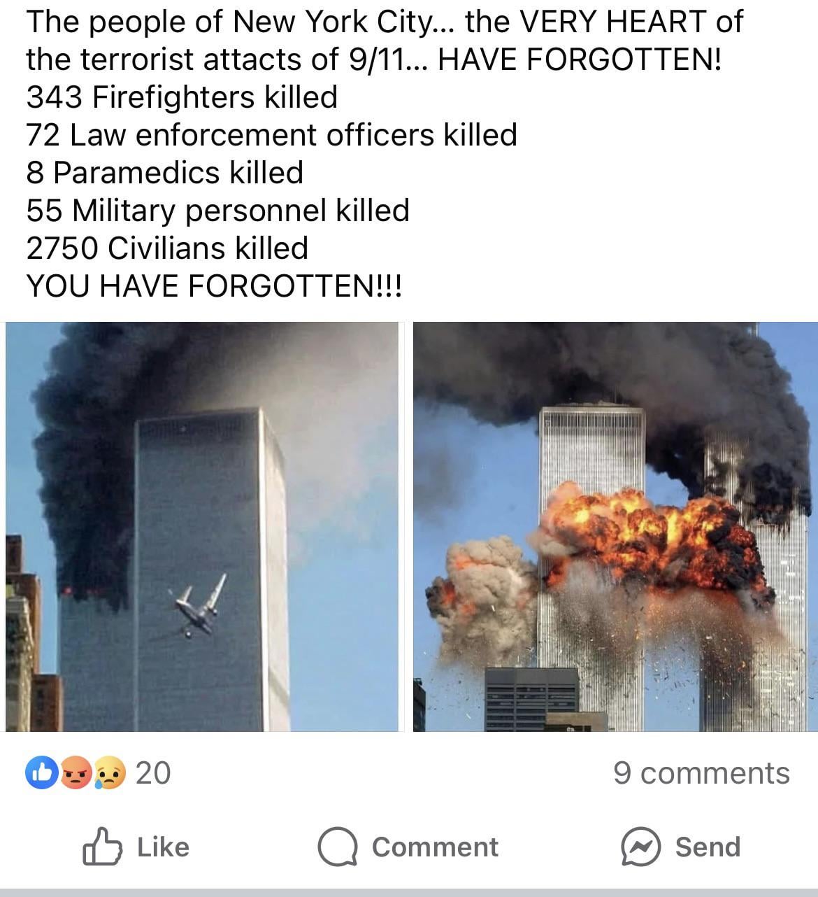 The only thing that’s been forgotten. Is the rampant racism and Islamophobia that sprang up after 9/11. I still remember Sikhs getting assaulted because Americans were so racist they thought anyone wearing a head wrap was a terrorist.