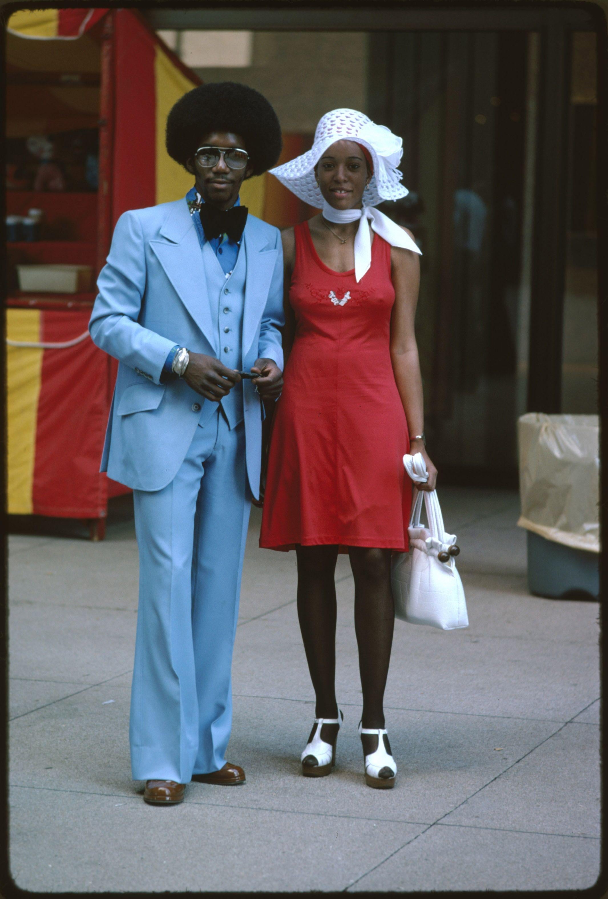 Young couple walking down the street in Chicago, Illinois, July of 1975. Kodachrome slide. by Electrical-Aspect-13