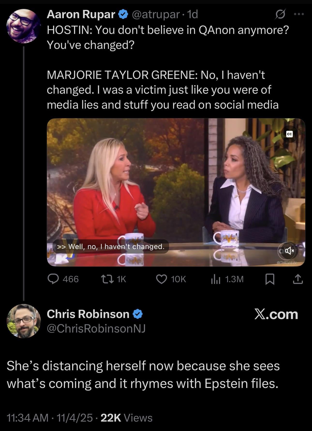 I doubt she ever believed in the QAnon stuff she spouted anyway. She’s 100% a self serving narcissist who will say whatever needs to be said to whoever it needs said to to secure the vote and backing for whichever stage of her career she’s in.