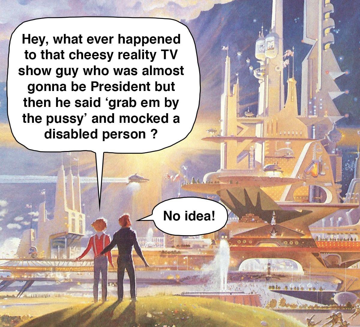 “Ohhh yeah, the guy from the Apprentice? I’m pretty sure he was convicted of being a child rapist and given the death penalty, along with his best friend Jeffrey Epstein.”