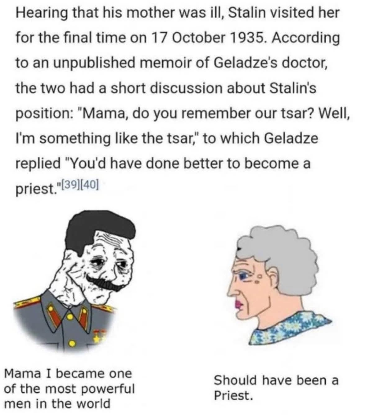 Since I don’t think Stalin was into young men, he would have made a better priest than many of them. And also considering we know him as not-priest, he would definitely be better than that. Who knows, maybe he would even die loved.