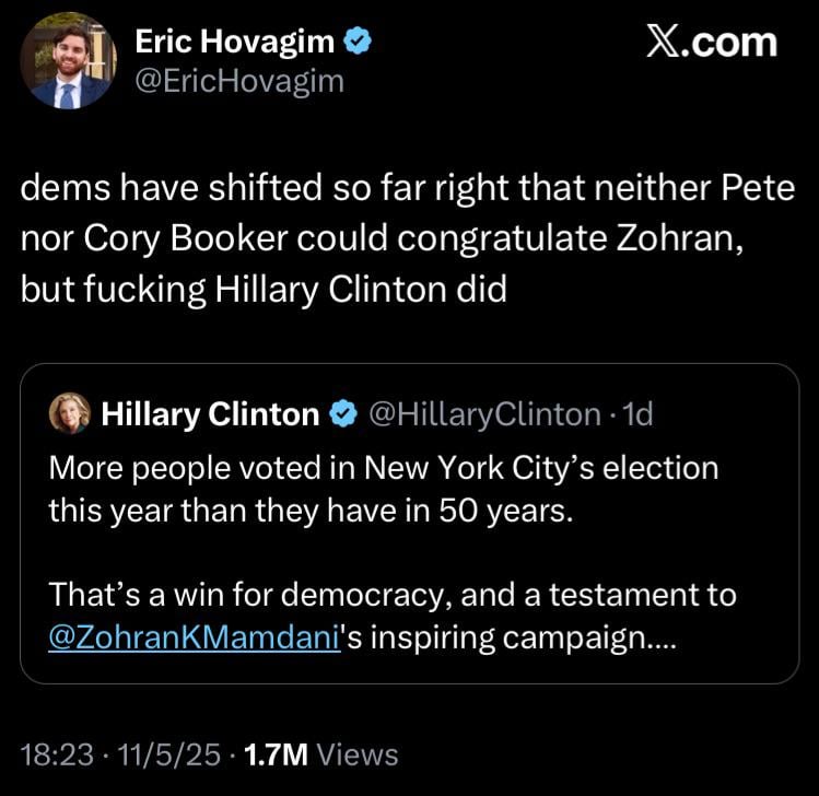 New-Freedom-6258 on November 6, 2025 8:53 am Pete thinks he has a chance in 28 and doesn’t want to piss off the so-called “centrists,” and Booker is an ineffectual corporate shill. Getting a congratulatory note from HRC is like getting an edible arrangement from Empress Dowager Cixi. It’s a nice gesture, but you definitely shouldn’t eat it.