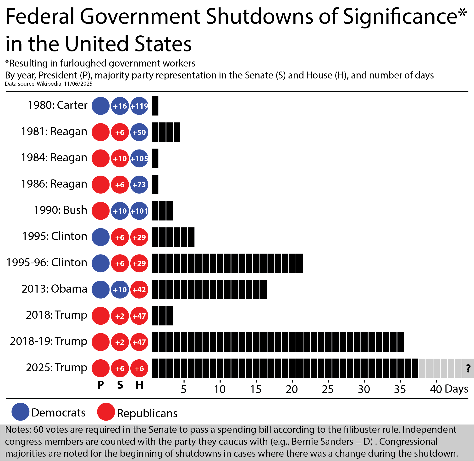 Created in Illustrator. Based on data from Wikipedia, primarily: [https://en.wikipedia.org/wiki/Government_shutdowns_in_the_United_States](https://en.wikipedia.org/wiki/Government_shutdowns_in_the_United_States)