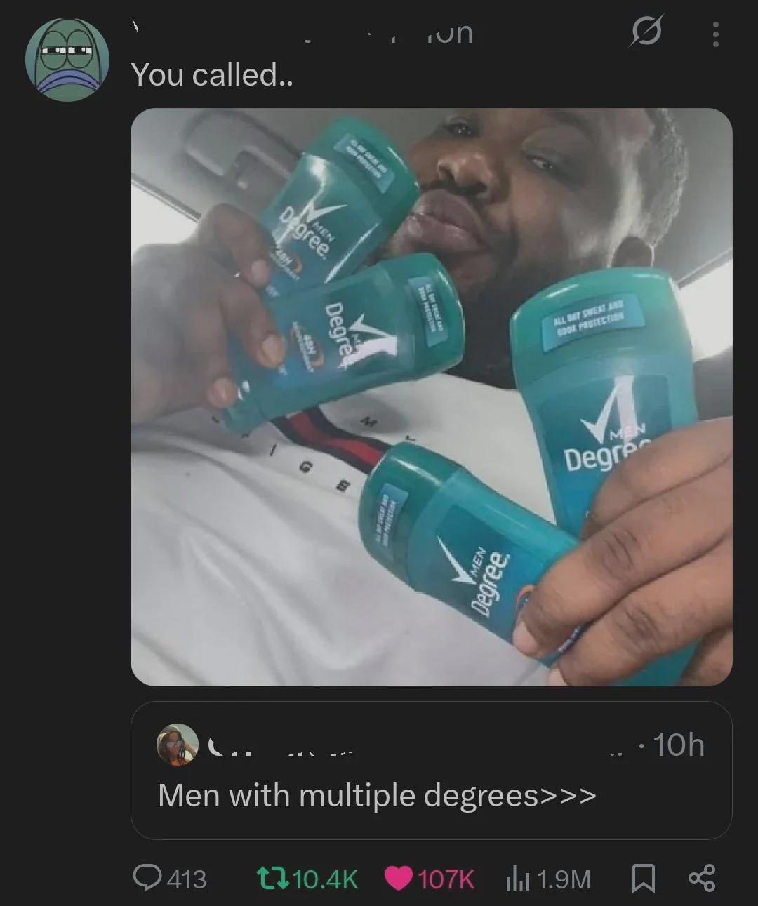 I mean a man with several college degrees that smells like ass all the time or a man who has a decent job out of high school, clever sense of humor and smells clean every time you meet him? Yeah, I know what I’d prefer too