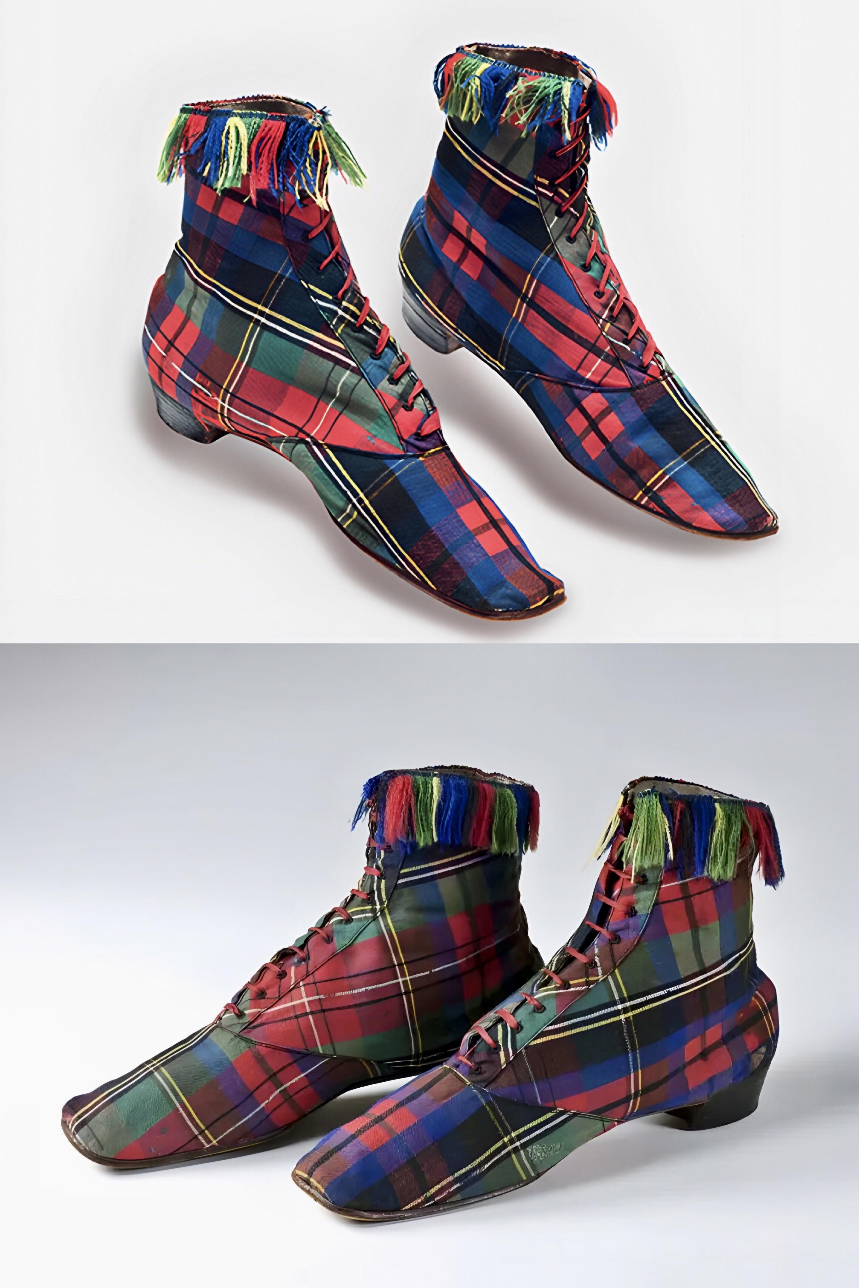 French tartan boots circa 1855-1865. With the aide of toxic aniline dyes, Victorian entrepreneurs invented “ancient” clan tartans in brilliant hues that became the height of fashion.