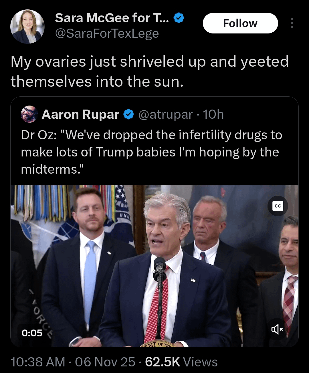 How friggin’ stupid is this guy?! I’m serious here. Is Dr Oz a total moron or what?!? No one takes infertility drugs to create infertility!! They take infertility meds so they can try to become pregnant. And look at the photo, it’s filled with stupid white Republican males with smug looks on their faces like “ahha, we got cha bitches, now you’re gunna have to have get pregnant and have babies just like Trump wants!!”
